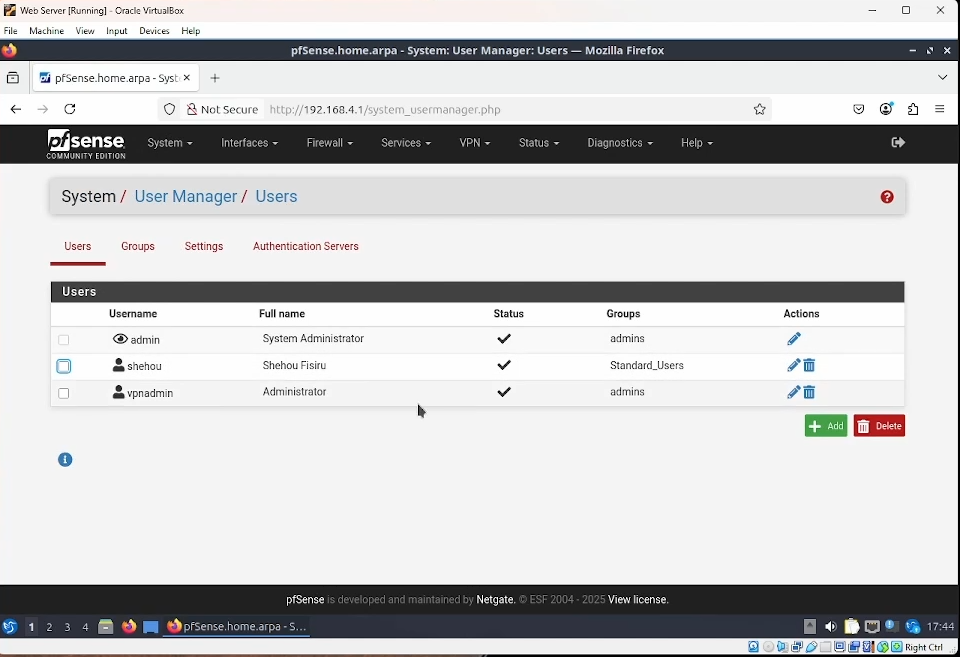 Pictured here are the network user accounts. The first one is the default administrator account, followed by a standard user account, accessible via VPN tunneling, as well as an administrator account accessible via VPN tunneling. They are assigned to the appropriate groups, allowing for appropriate permissions.