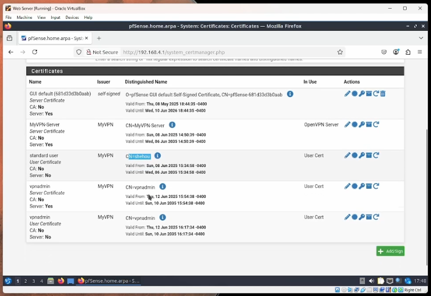Pictured here are the certificates created for each user. The certificate is bundled into the client configuration package, since each user downloads a custom client VPN configuration. The certificates are used to authenticate, and help designate user specific permissions.