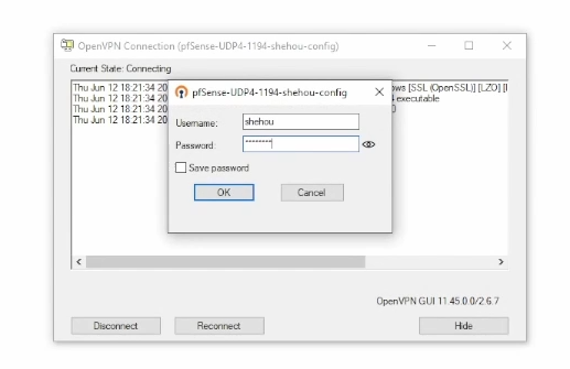 Pictured here is the OpenVPN client interface from my laptop, which is not connected to the VM’s network. I attempt to log into the standard user account in order to access the company portal, as well as communicate with other workstations on the 192.168.2.0 subnet, allowing me to access all of the VM network resources.