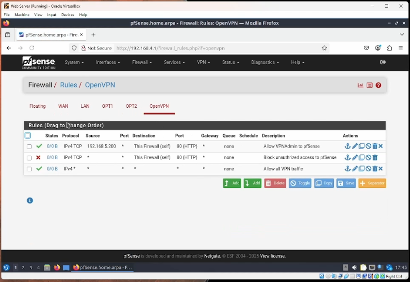 Pictured here are the firewall rules for the VPN. The initial rule is allowing the IP address 192.168.5.200, which was designated for the vpnadmin profile, to have access to the firewall GUI via HTTP. Immediately below it is a rule prohibiting access to the firewall GUI from all other users.