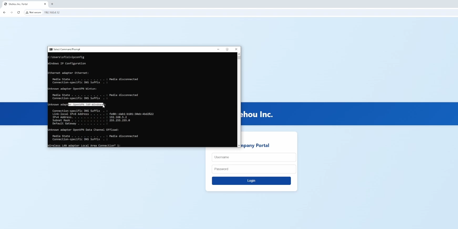 Pictured here is me successfully accessing the company portal after authenticating with OpenVPN, as well as displaying my newly obtained IP address on the 192.168.5.0 subnet for the VM’s network. I also pinged a local workstation on the 192.168.2.0 subnet, as well as used SSH.