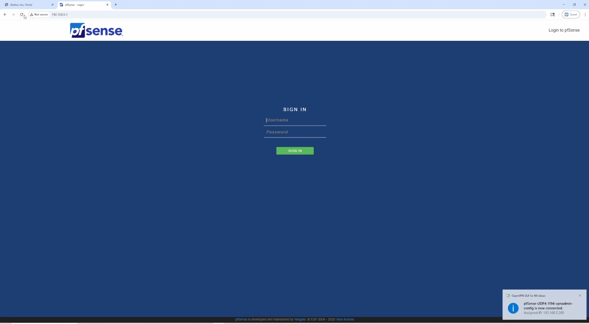 Finally, pictured here is me successfully accessing the pfSense GUI after authenticating with the admin profile in OpenVPN client. As you can see in the bottom right, I am assigned the static IP address that I designated in the firewall rules to be able to access the firewall GUI.