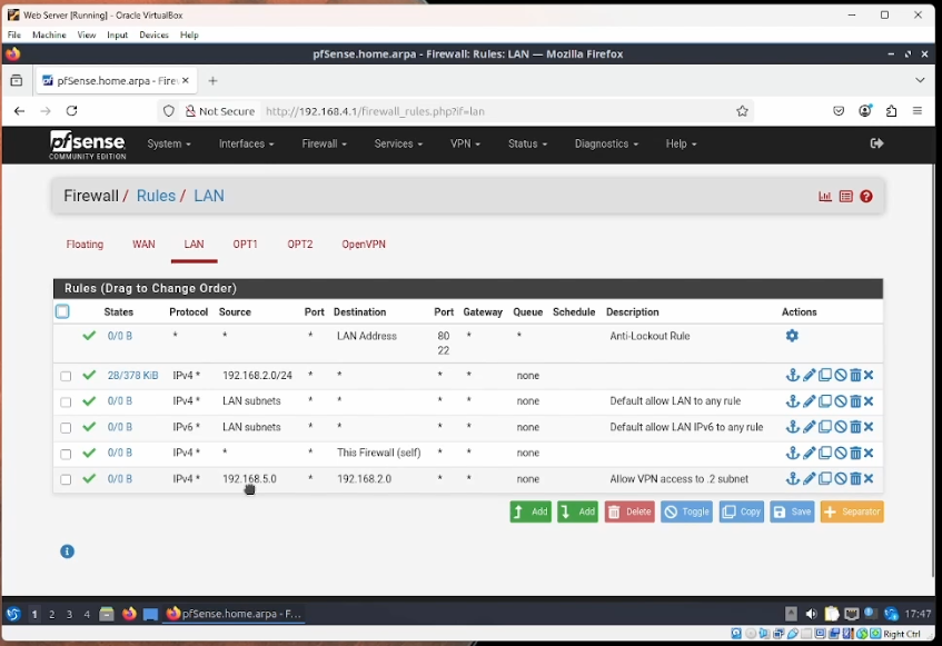 Pictured here, the final firewall rule is allowing communication from devices on the 192.168.5.0 subnet, VPN devices, to communicate with devices on the 192.168.2.0 subnet, where the windows workstations lie.
